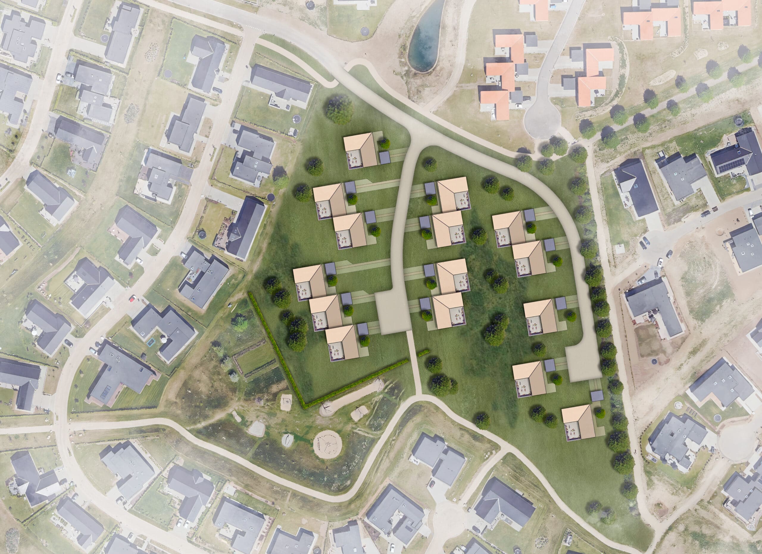 Områdets skrånende terræn har inspireret til en gårdhavebebyggelse, som er organiseret, så husene følger landskabets bløde kurver og er placeret med gårdhaverne mod syd.